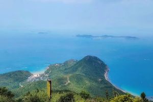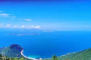 山顶两侧是大海、远处飘浮的小岛、天空的白云