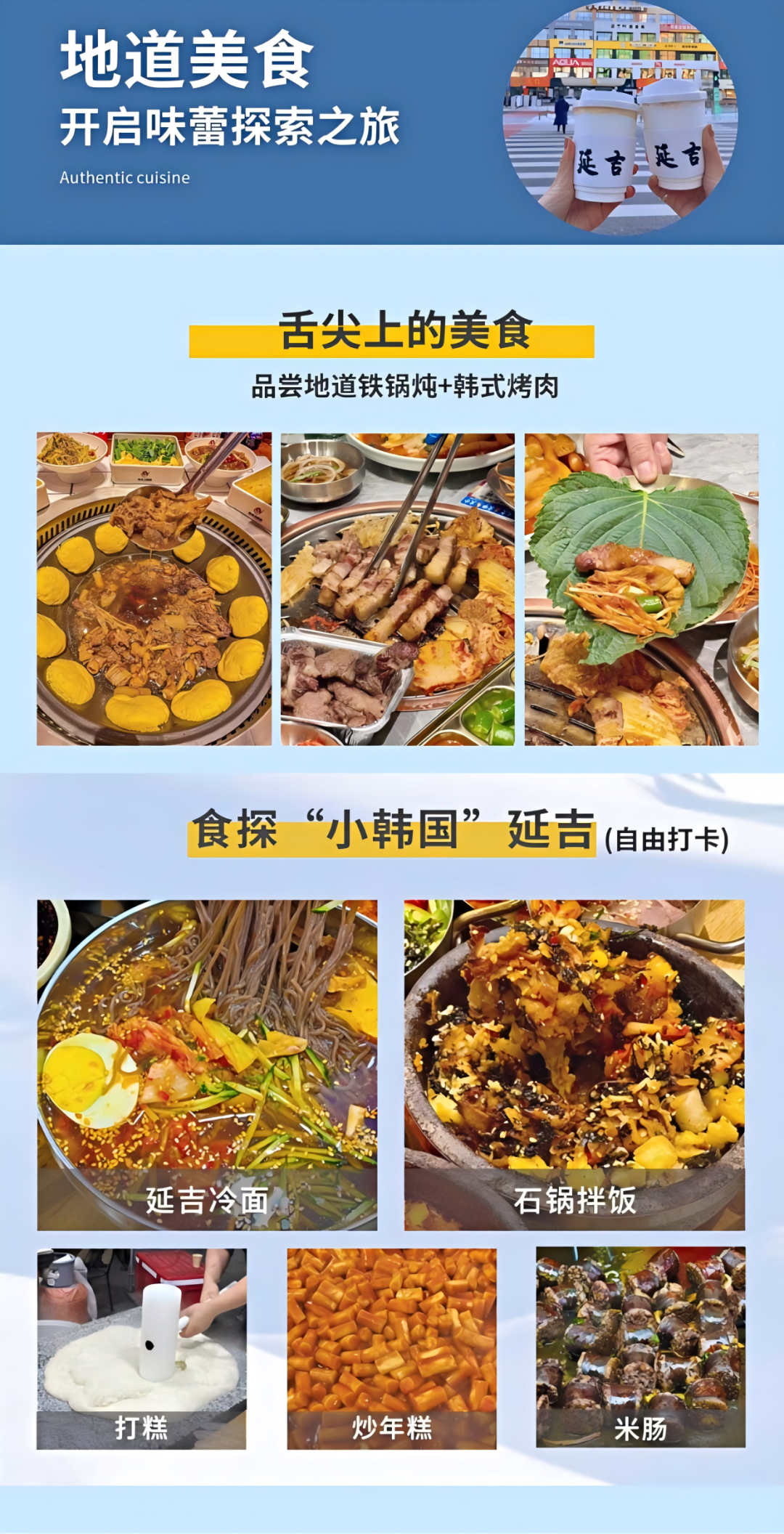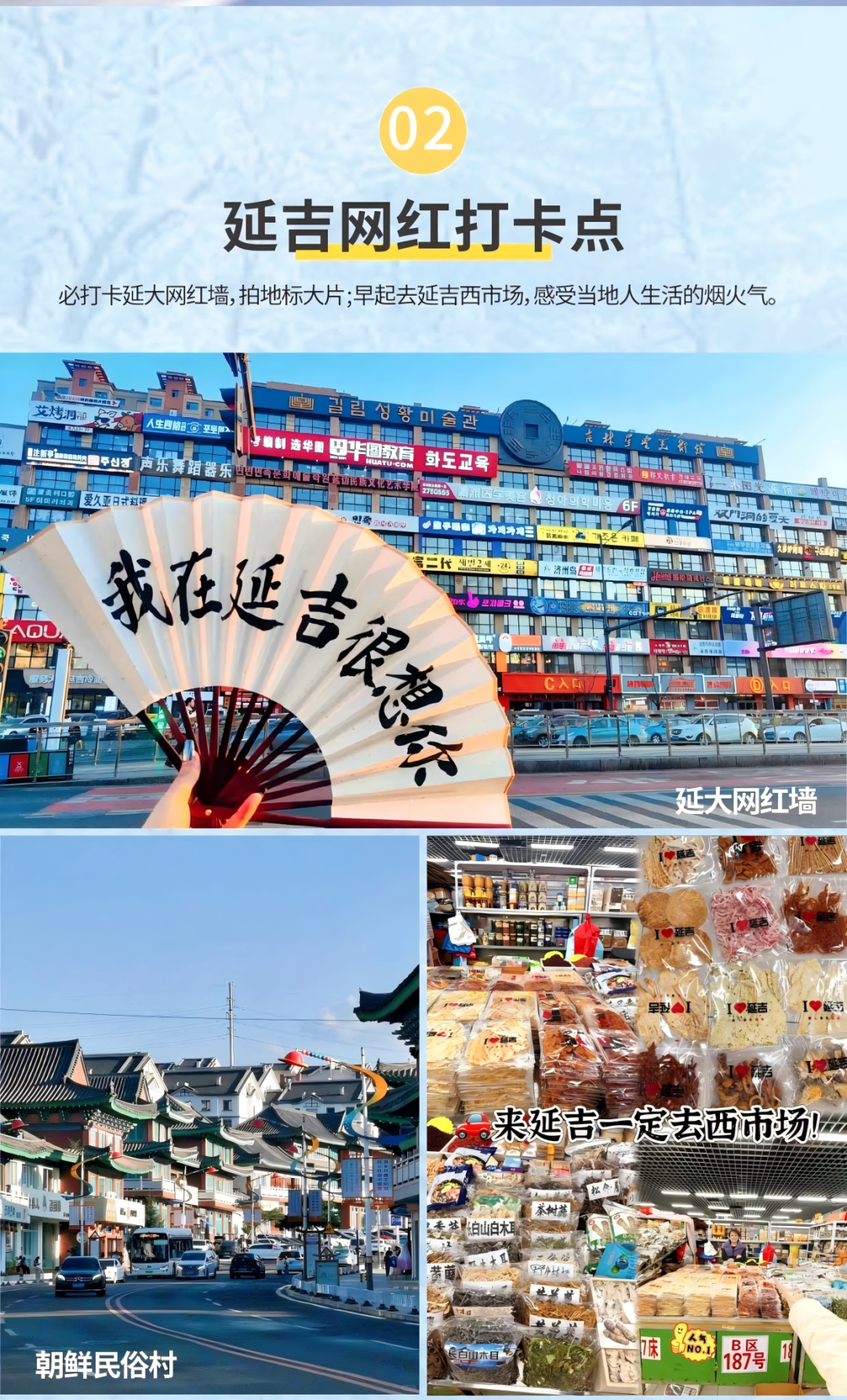 适时前往延吉市前往打卡【延边大学网红墙】(建议 17:00-21:00 期间游览此景点,逛吃逛吃从这里开始)品味延边特色美食,在这里仿佛是身处于韩国街头,高高的十几楼都挂着牌匾,【每日隆韩货码头】体验韩剧同款购物乐趣,来延吉必打卡的韩潮购物天堂!