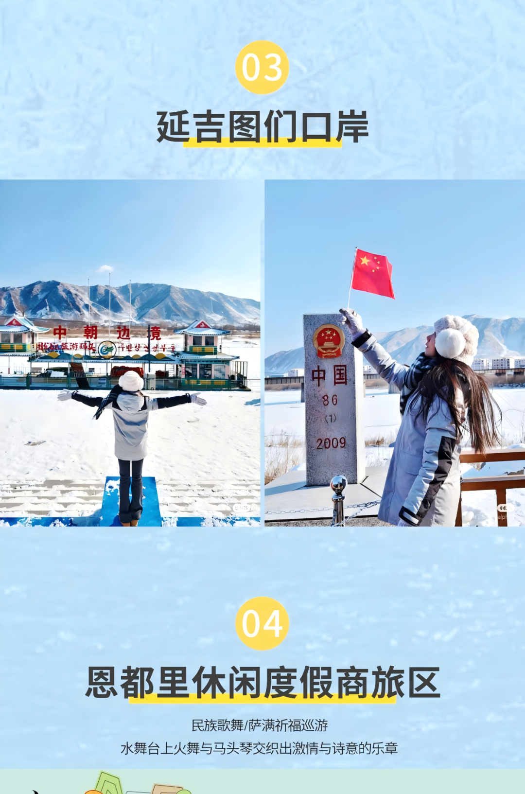 2)行程内标明景点的第一道大门票(长白山大门票+摆渡车+环保车、图们口岸、朝鲜民俗园);