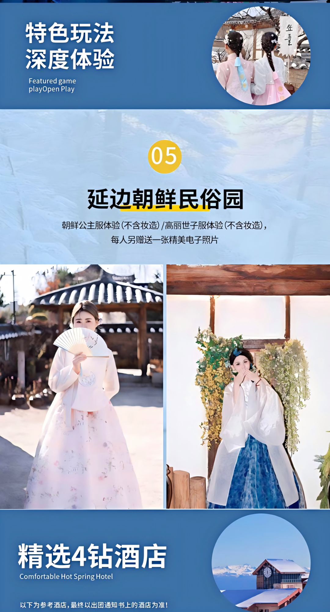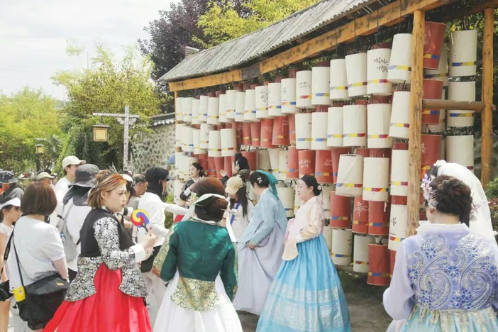 下午前往【中国朝鲜族民俗园】赠送:朝鲜公主服体验,高丽世子服体验(不含妆造),每人另赠送一张精美电子照片(赠送项目,不用不退)。民俗园里无处不在的朝鲜族风情,随手一拍都有韩剧女主角Style。