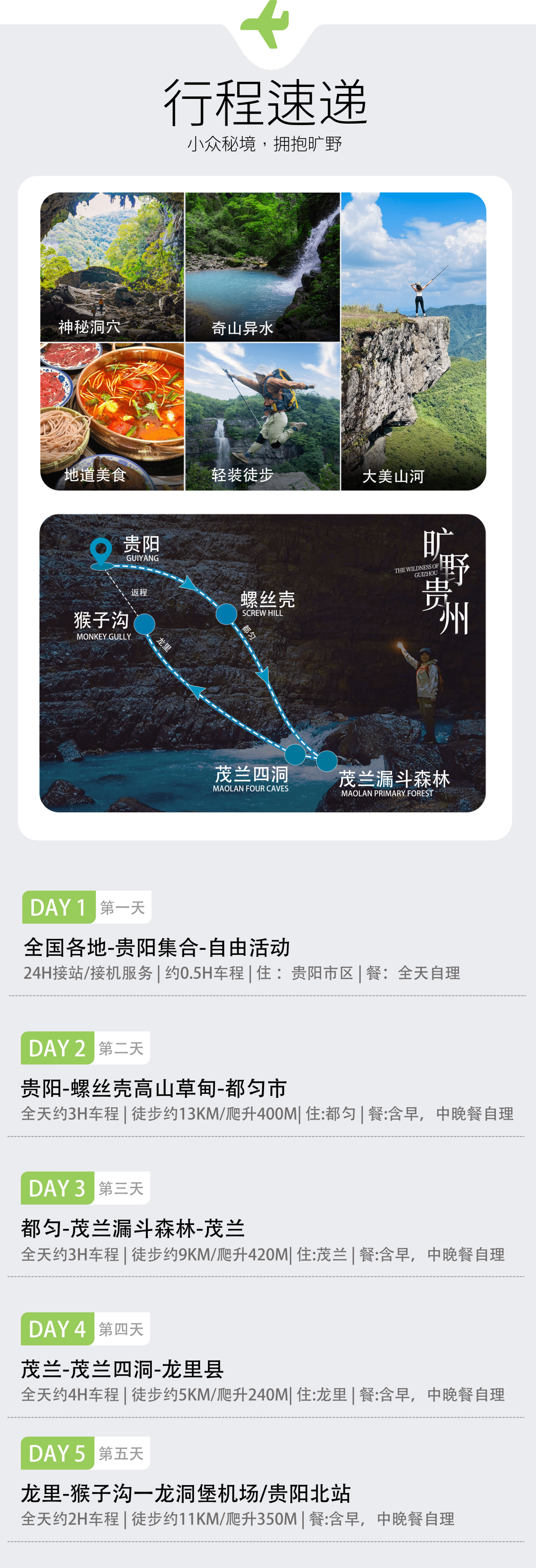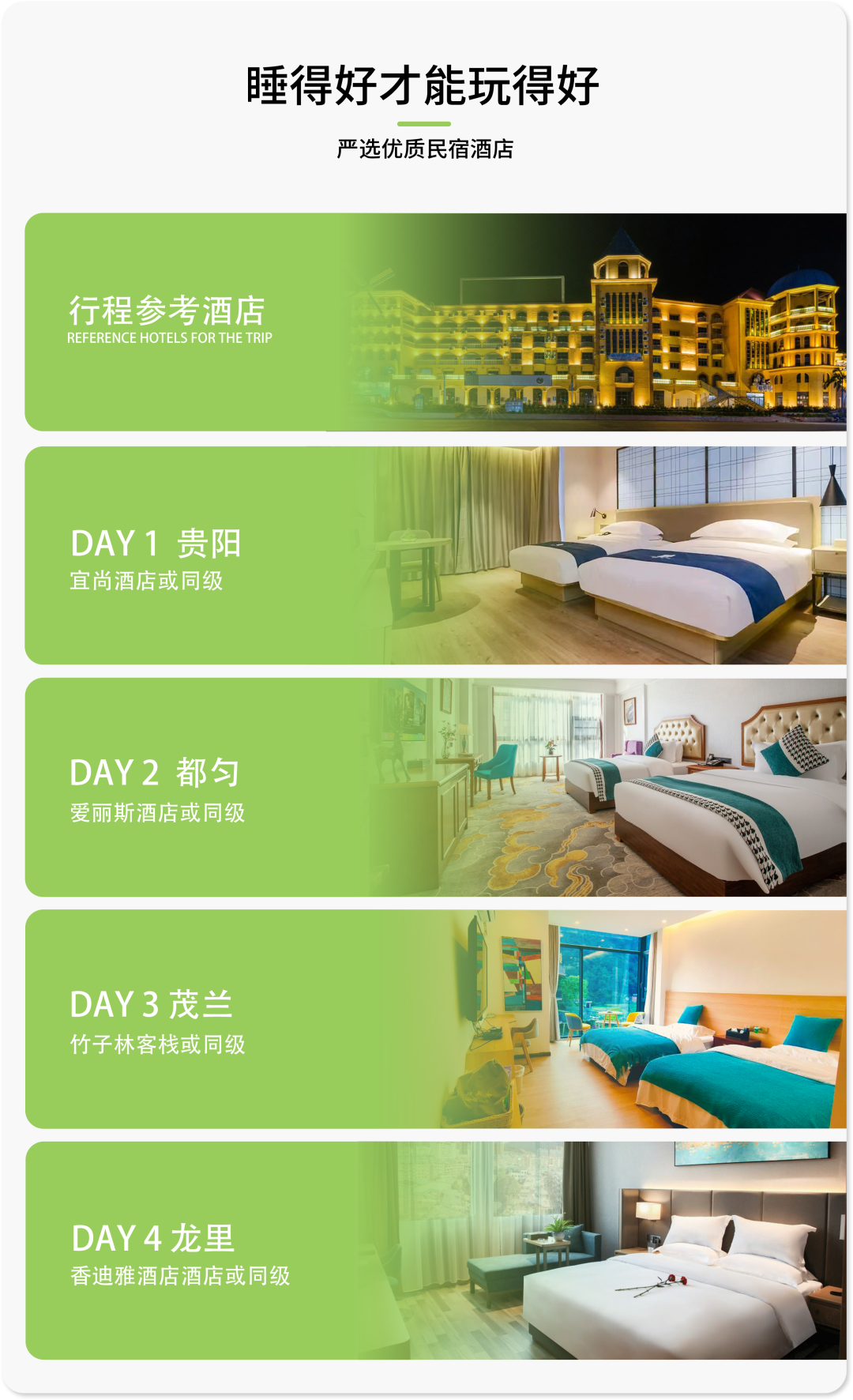 ➁ 住宿:贵阳1晚+都匀或荔波1晚+茂兰1晚+龙里1晚酒店(2人/间)