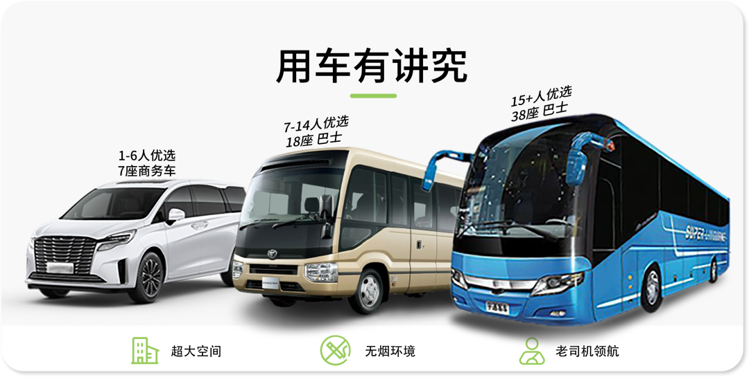 ➀ 用车:当地行程用车(根据具体人数选配车型:5-38座)