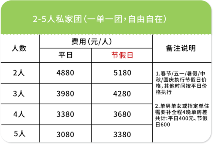 ➂ 单房差:单人报名默认同性拼房(拼房不成功无需另付单房差);指定单住或1成人带1儿童(需补全程4晚单房差价共计:平日400元/春节.五一.暑假.中秋.国庆600元)2人一起报名默认住1间房(如需分开住请主动说明)