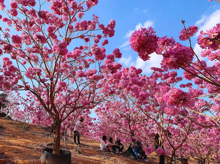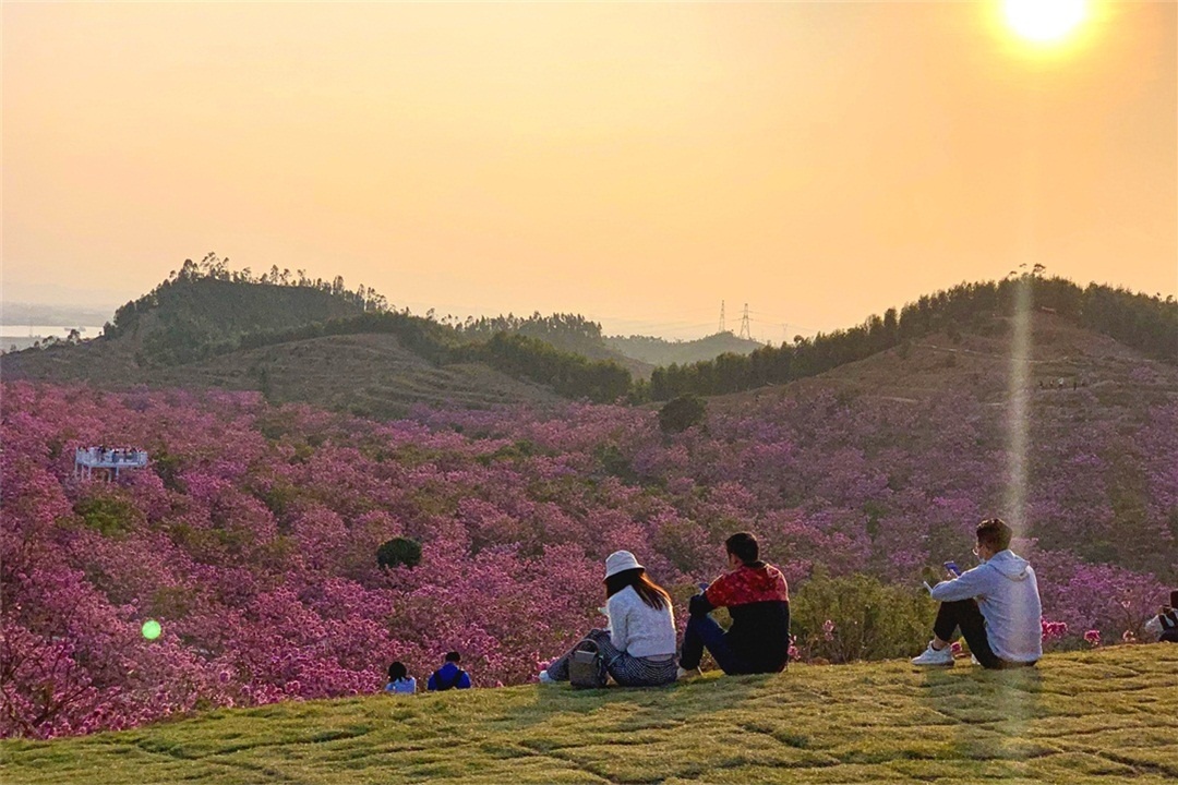 14:50 到达【绿美生态园】,占地千余亩的紫花风铃木林场,每逢冬季,这里的风铃花争相怒放,浪漫花海开满山头,形成一片姹紫嫣红的海洋