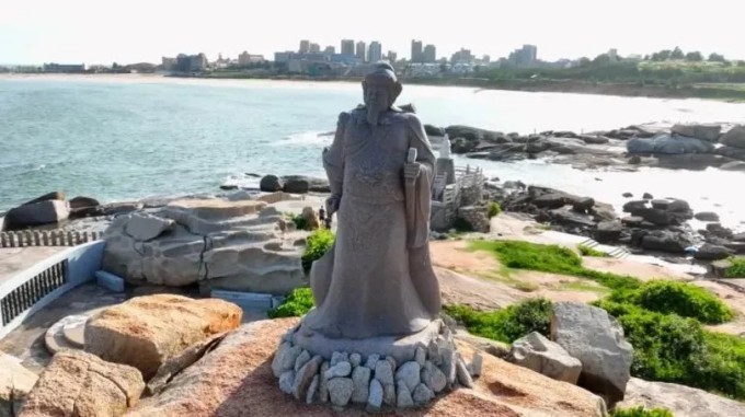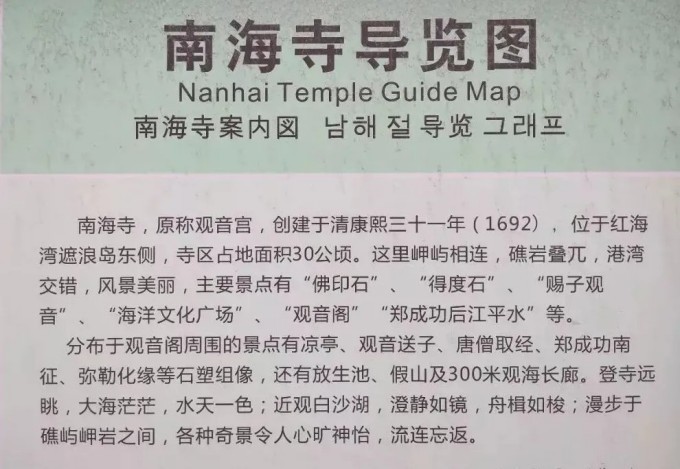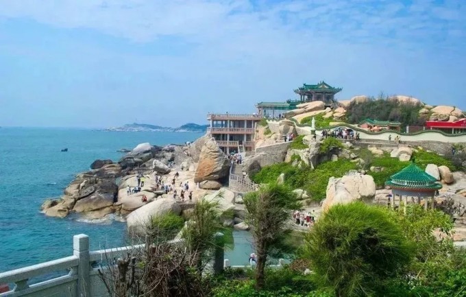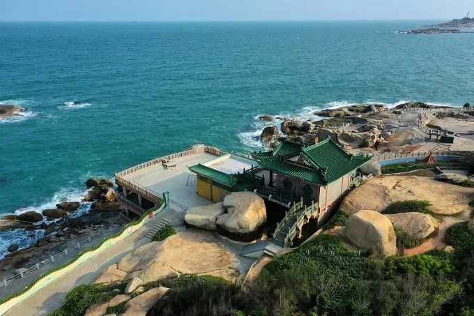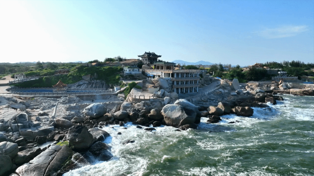 靠近岬湾的巨岩旁建有一座“观音宫”,内供观世音雕像,宫门两旁镌刻一副联内嵌入“南海观世音”五字的对联:观天有色西江月,听世无音南海潮。
